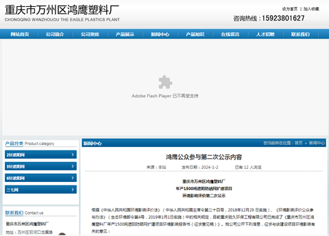 重庆市万州区鸿鹰塑料厂年产1500吨遮阳防晒网扩建项目环境影响报告书和公众参与说明报批前公示采取网络公示,通过网站进行公示,网络公示时间为 2024年5月7日 ,网址为http://www.cqwzhysl.com/Article3/22.html。